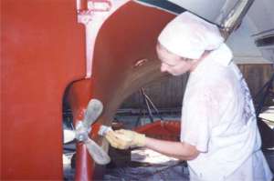 8) Apply the paint heavily with the roller, up-and-down, tipping it with the roller into the area you just painted. (One gallon of paint was good for one coat on a 27-foot boat.)