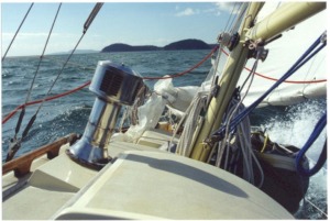 Once out of Peavine's grip we raised sails and beat our way to the south end of Cypress Island in increasingly bouncy seas. Since the water current was in the opposite direction of the wind, the waves were much larger than we expected. After we finished lunch we made a left turn and beam reached into Guemes Channel.