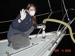 Rascal stopped at the WAC dinghy dock and we unloaded all the gear into the van and cleaned her up. Rich was there on CTB and he loaned us a climbing harness so I could go up the mast and free the jammed main halyard. We wanted to use the main winch so we re-rigged a halyard by relocating its turning block higher on the mast then back to a headsail sheet turning block and up to the main winch. Scott Tobiason had me on the spinnaker halyard and Rich had me on the jib halyard and up I went. Once aloft, it took me a while to free the jammed halyard but finally I got it and returned to the deck.