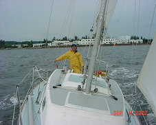 protection of the nearby land Rascal became overpowered so we dropped the spinnaker. We had a little excitement with this maneuver. We set the #2 Jib and had a nice