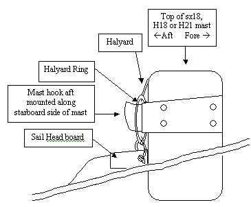 (clock forward) setting the mast hook under the halyard ring. Dropping the sail