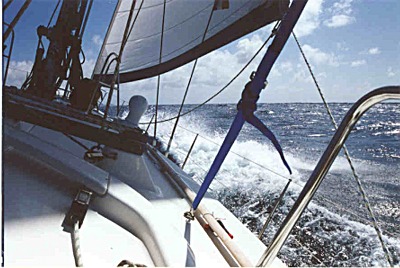 Phew! Well, no sleep was to be had. The seas built up an we pounded and pounded, it sounded like the boat was going to split at the seams! By the time I got a wakeup knock, I was feeling pretty queasy, probably had something to do with being bounced around like a superball with a full stomach. Once out of my berth, the queasiness went away. Bob got off watch, went below to plot our position, got halfway done and then spent 15 minutes hurling in the sink. It smells really good down there now! Kathy took the wheel after Ken, who then promptly began unloading his dinner off the back of the boat. Our crew is kind a hurtin’! The seas were bigger, and a squall tried to catch us just as I took the wheel. I somehow managed to steer around it and all we felt were icy cold downdrafts. There was lightning everywhere! Those storms look every bit as ominous as the books show. Our watch is over and we are at St Martin, but we are motoring off shore waiting for another squall to pass before going in. The sector light is out, and I can’t wait to sleep, I am completely drenched and crusted over in salt! Lesson #2-No one in there right mind does an open ocean passage to